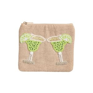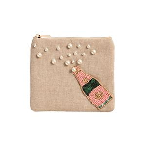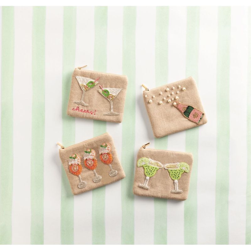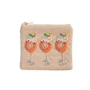 Embroidered cotton zipper case features hand beaded exterior and cotton lining.