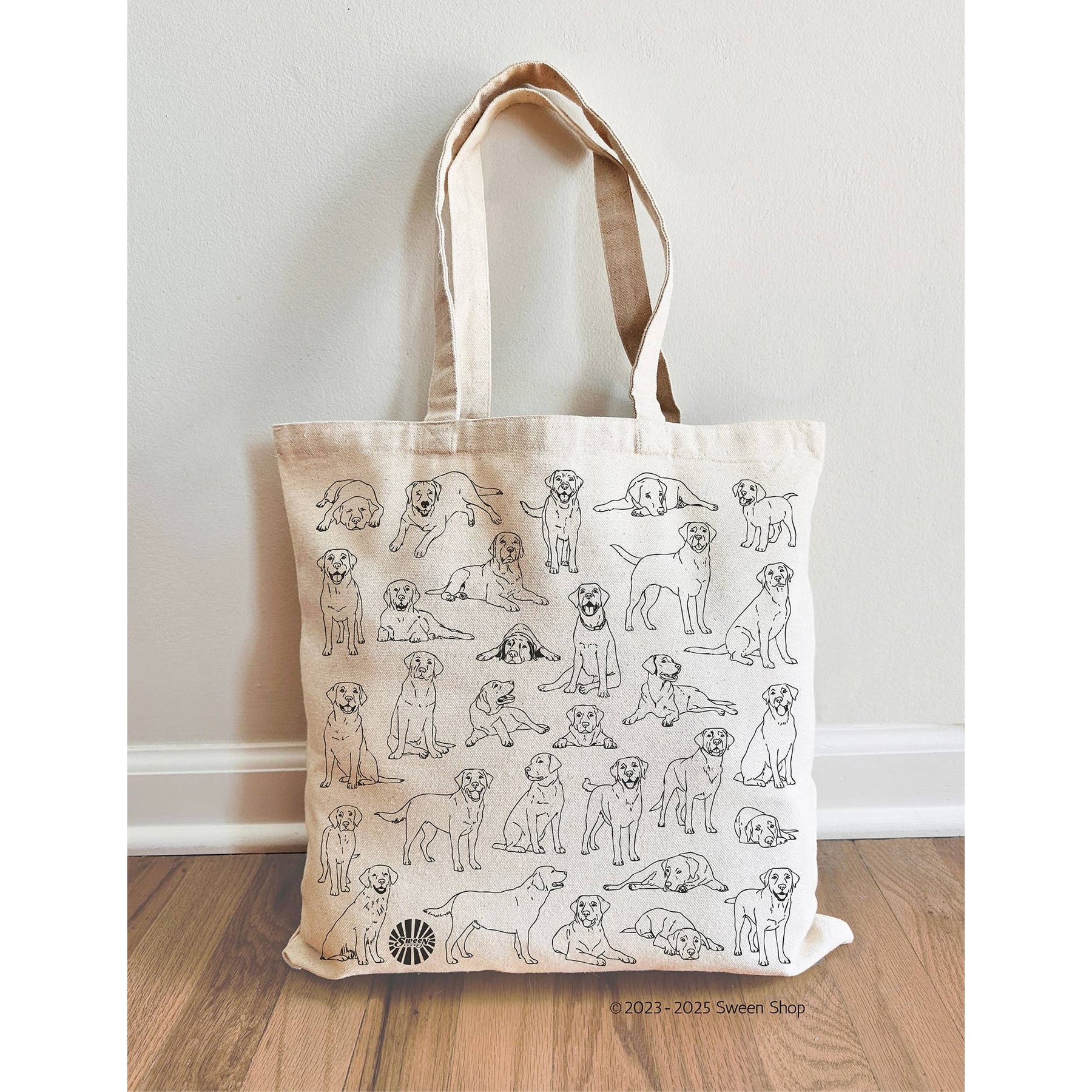 Labrador heavy weight cotton canvas tote bag features a collection of hand-drawn Labrador illustrations. This spacious reusable tote bag is perfect for carrying books, shopping, the gym, office, weekend trip, or everyday use. The design is printed on one side of the bag. Featuring 26” long handles to comfortably wear the bag over your shoulder. Stress points are reinforced for durability. Makes a perfect gift!