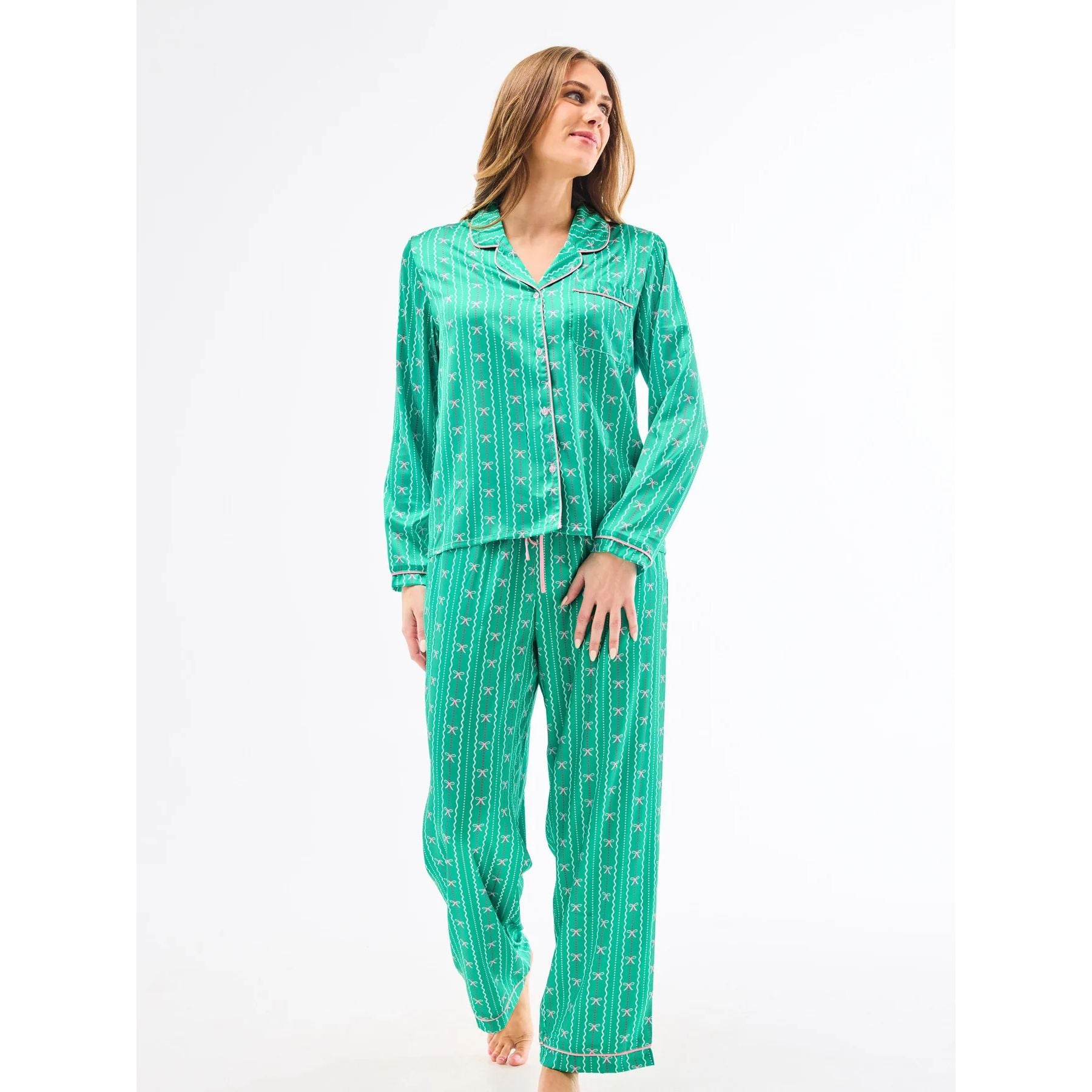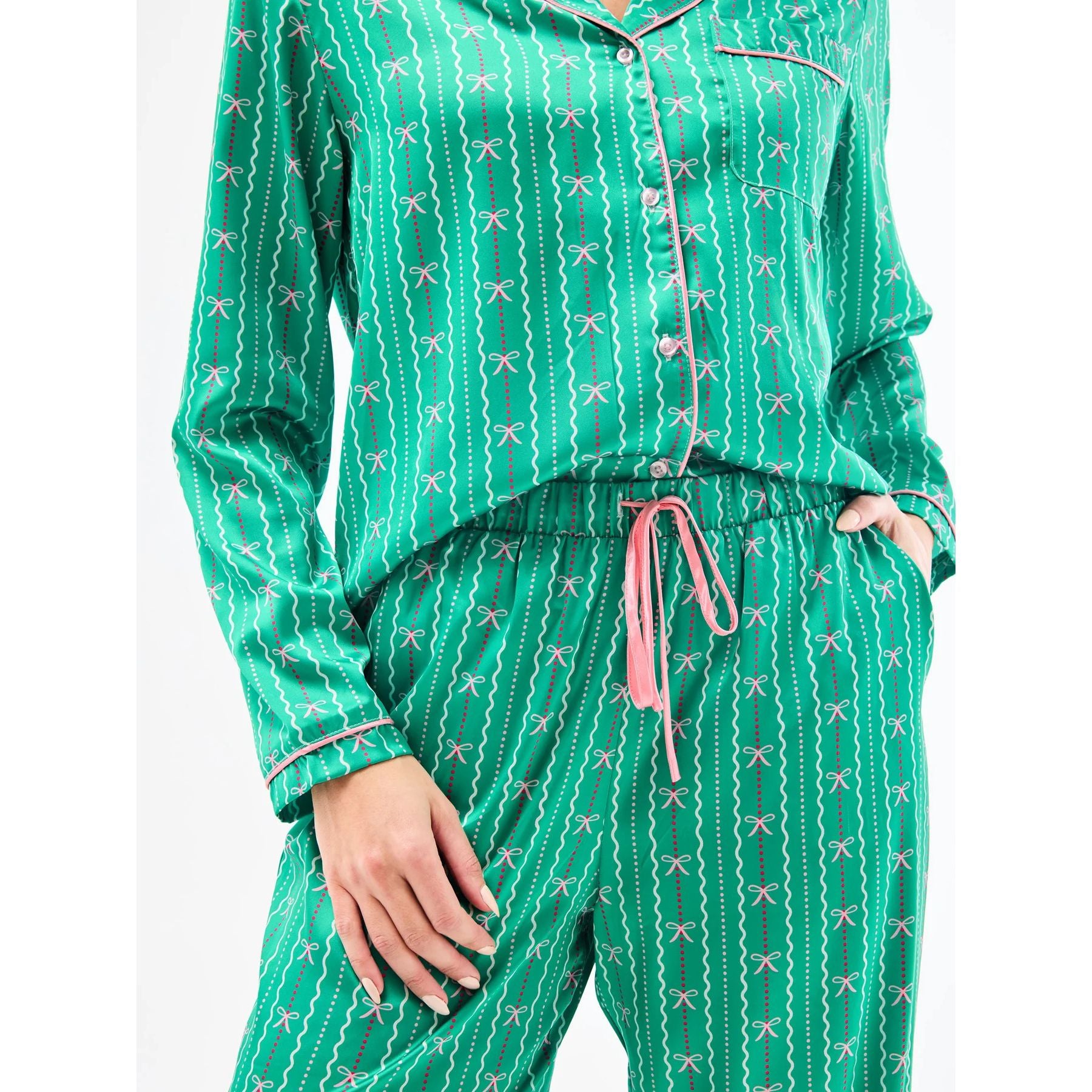 Introducing our Holiday Charlotte Satin Pajama Set, where luxury meets cozy relaxation. Perfect for sipping cocoa by the tree or enjoying Christmas morning in comfort, this pajama set brings festive elegance to every moment. Featuring a button-front top with a classic collar and straight-leg pants with an adjustable drawstring, our Charlotte Satin Pajama Set combines timeless style with all-day comfort.