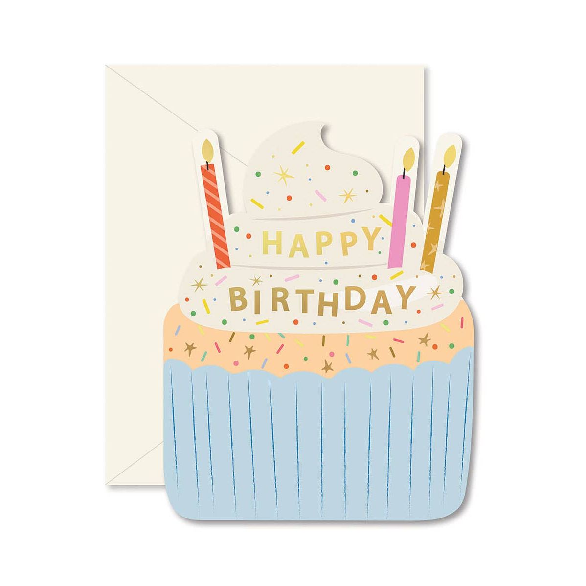 A fun and colorful cupcake die-cut folded greeting card and coordinating envelope to wish a very (sweet) Happy Birthday!