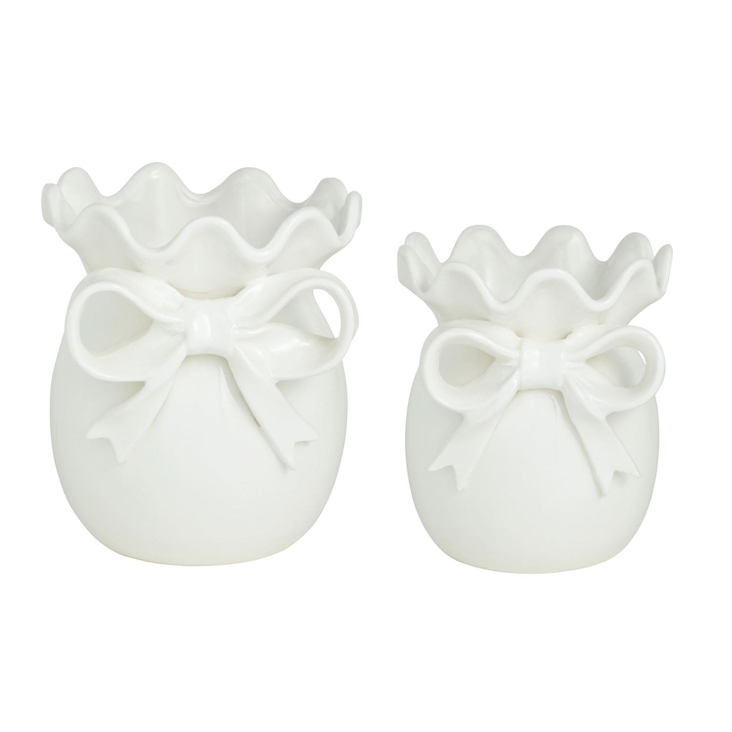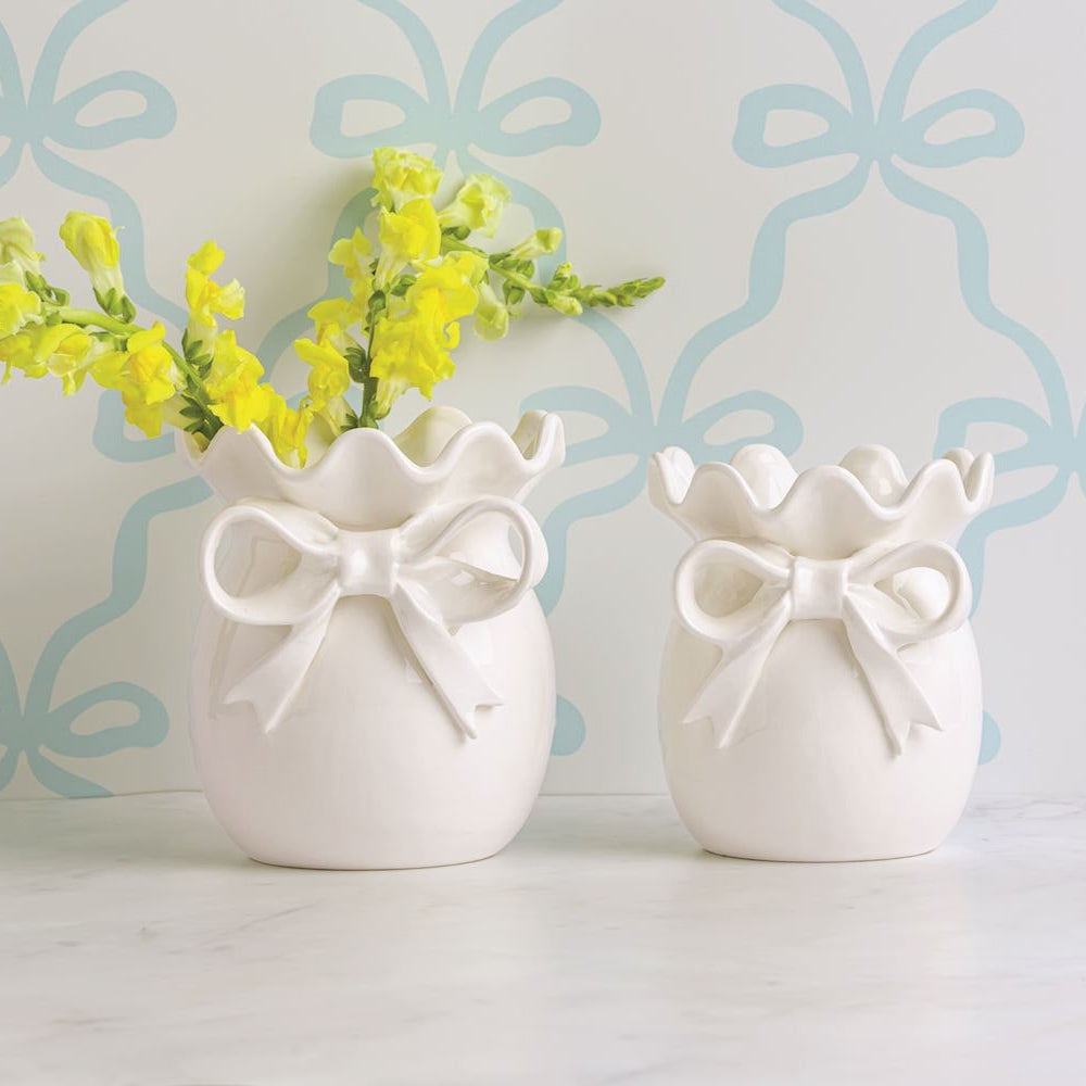 Ceramic vase features dimensional ceramic bow and ruffle rim.