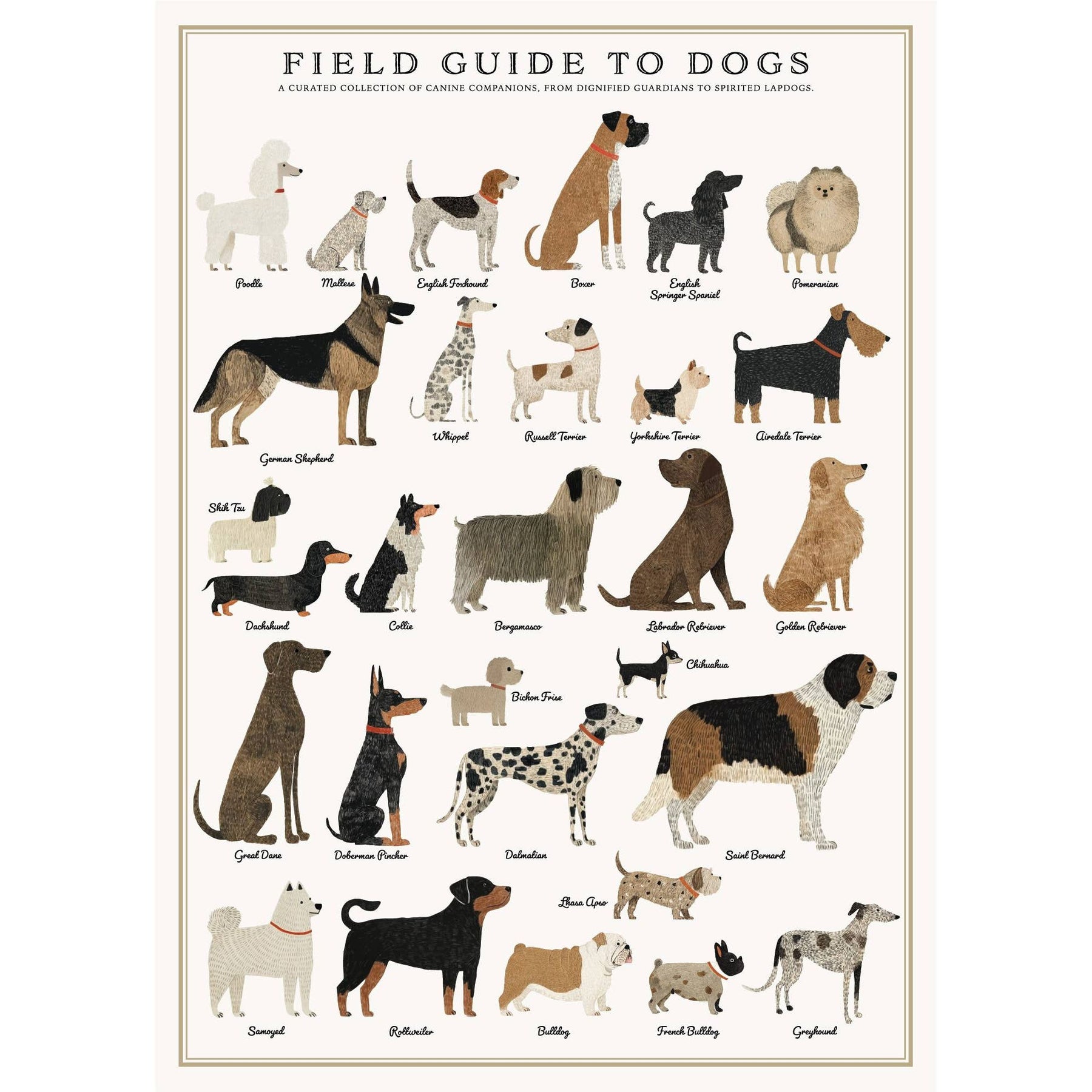 Enjoy assembling this beautiful 500 piece puzzle, designed with illustrations showcasing common and iconic dog breeds.