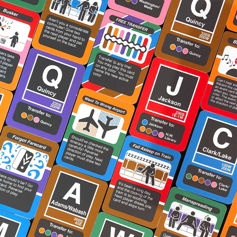 Gather your friends and sit down to play LOOP: The Elevated Card Game. Ride the rails of the elevated trains in Chicago's famous Loop! Match the line colors and stations to make your way around town, but beware the everyday perils of rush hour crowds, forgotten farecards, and mysterious puddles as you get where you're going! This fast-playing card game is perfect for 2-7 players aged 9+. Designed and produced by Transit Tees, LOOP is sure to take your next game night on a fun ride!