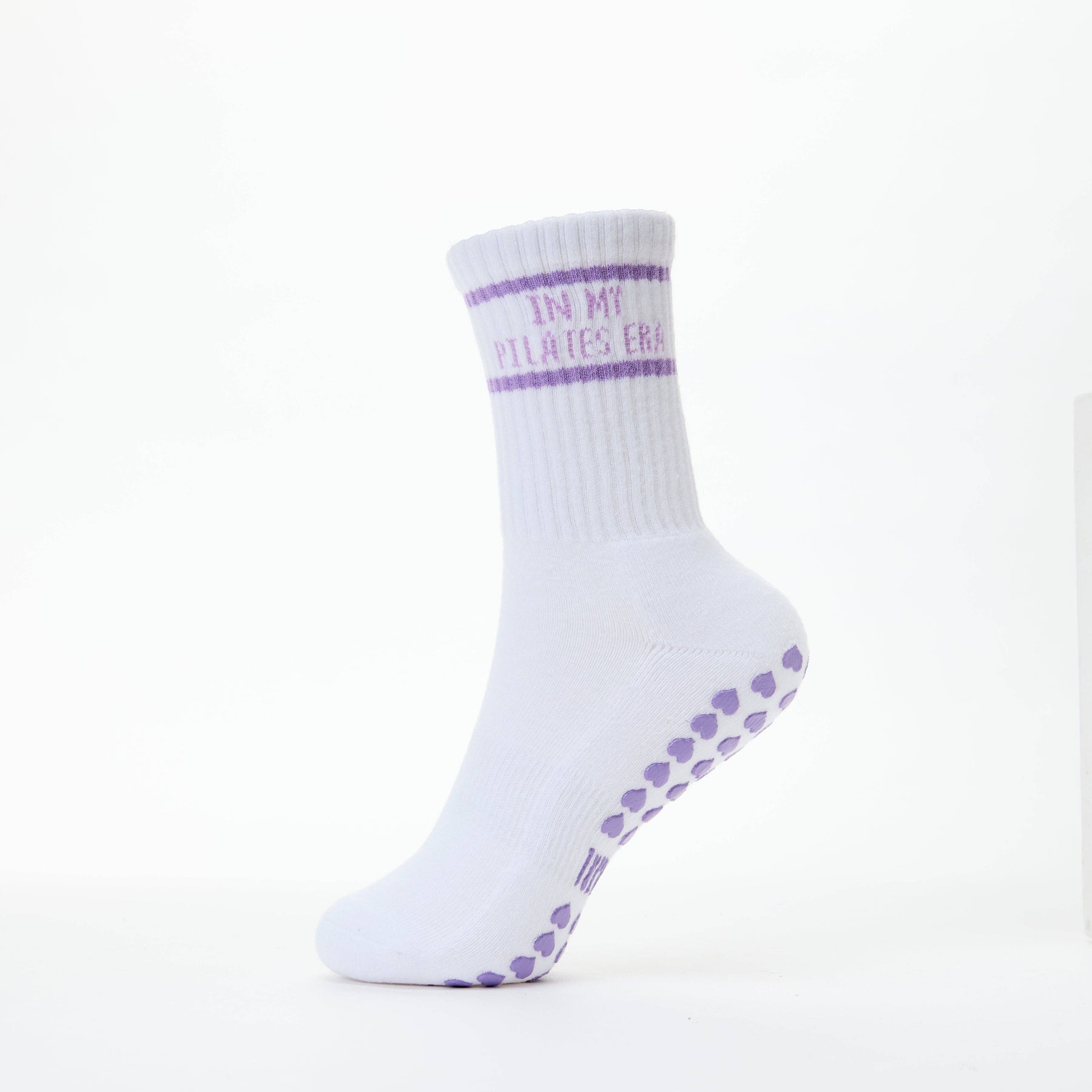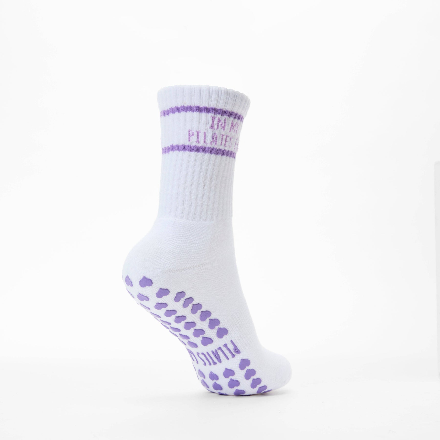 Our new "In My Pilates Era" Pilates Grip Socks will be the cutest thing to walk into your Pilates Class. Our grip socks are made with a cushioned sole so you will workout in both comfort and style. Featuring Love Heart Shaped Grips on the sole and "In My Pilates Era" text.