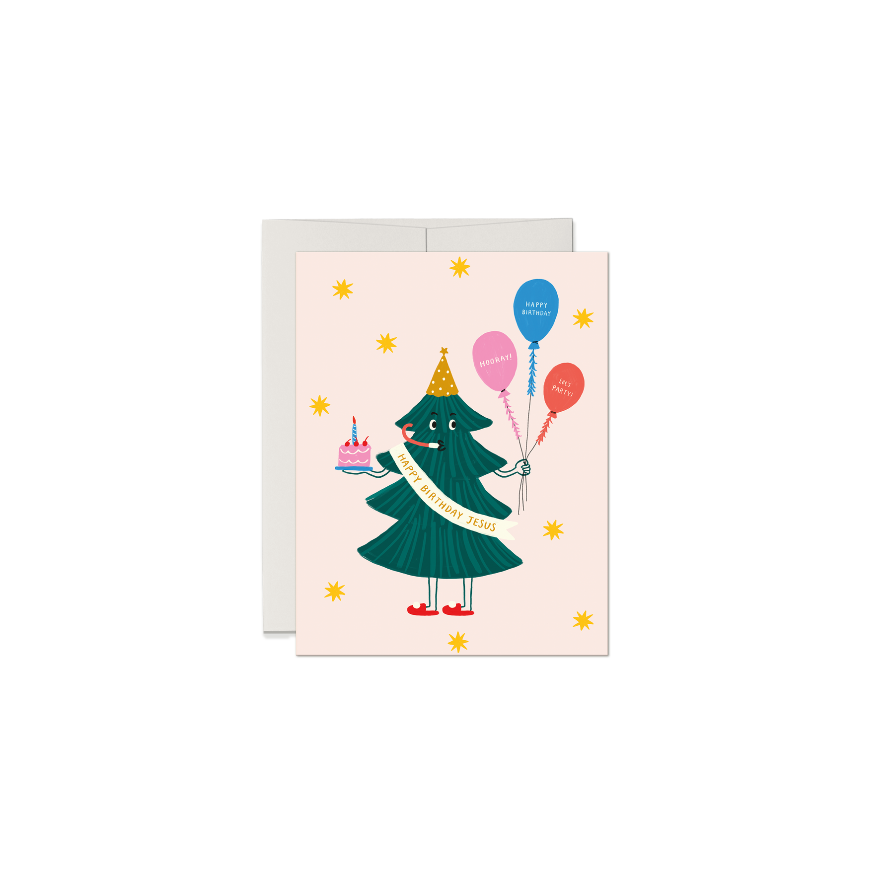 A whimsical holiday card featuring a festive Christmas tree holding balloons and cake with the banner “Happy Birthday Jesus.”