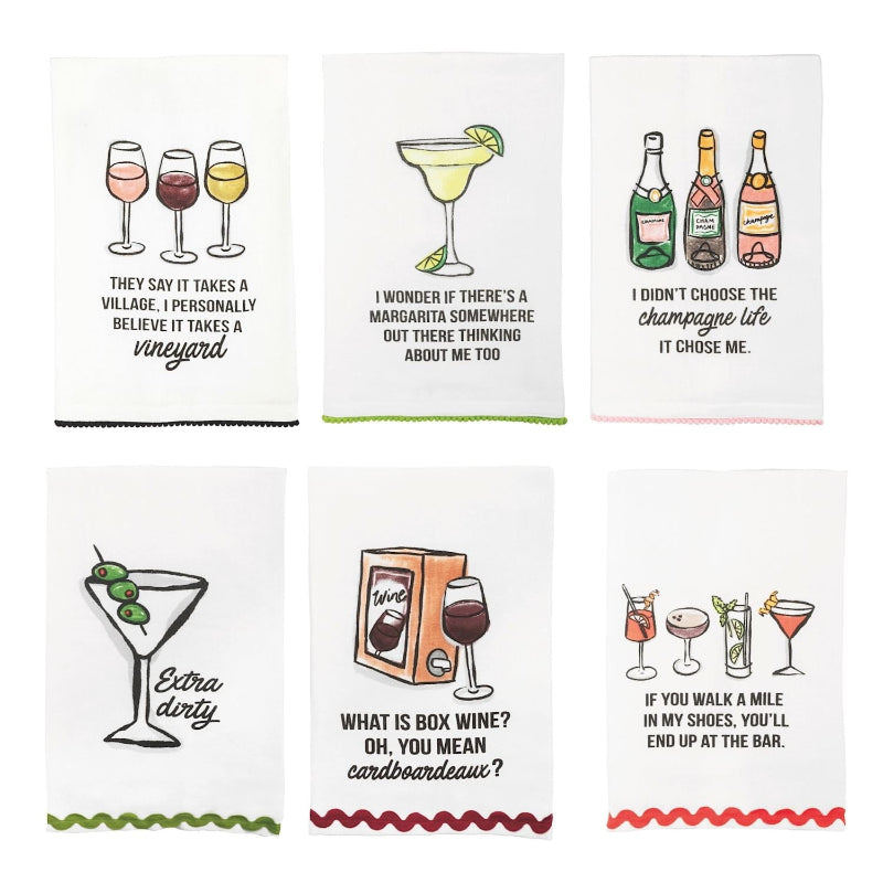 [{"id":41978383302736,"title":"Box Wine","option1":"Box Wine","option2":null,"option3":null,"sku":null,"requires_shipping":true,"taxable":true,"featured_image":{"id":35699922600016,"product_id":7288196759632,"position":2,"created_at":"2026-01-25T14:04:07-06:00","updated_at":"2026-01-25T14:04:37-06:00","alt":"The Mud Pie Art Towels are cotton hand towels with a wine box and glass illustration, witty \"What is box wine? Oh, you mean cardboardeaux?\" text, and playful pom-pom trim for added charm.","width":300,"height":300,"src":"\/\/figtreechicago.com\/cdn\/shop\/files\/box_wine_art_towel_1.jpg?v=1769371477","variant_ids":[41978383302736]},"available":true,"name":"Art Towels - Box Wine","public_title":"Box Wine","options":["Box Wine"],"price":1200,"weight":0,"compare_at_price":null,"inventory_management":"shopify","barcode":"198981057394","featured_media":{"alt":"The Mud Pie Art Towels are cotton hand towels with a wine box and glass illustration, witty \"What is box wine? Oh, you mean cardboardeaux?\" text, and playful pom-pom trim for added charm.","id":27090008866896,"position":2,"preview_image":{"aspect_ratio":1.0,"height":300,"width":300,"src":"\/\/figtreechicago.com\/cdn\/shop\/files\/box_wine_art_towel_1.jpg?v=1769371477"}},"requires_selling_plan":false,"selling_plan_allocations":[]},{"id":41978383335504,"title":"Champagne","option1":"Champagne","option2":null,"option3":null,"sku":null,"requires_shipping":true,"taxable":true,"featured_image":{"id":35699922698320,"product_id":7288196759632,"position":3,"created_at":"2026-01-25T14:04:19-06:00","updated_at":"2026-01-25T14:04:37-06:00","alt":"The Mud Pie Art Towels are white cotton hand towels with ric-rac trim, featuring three champagne bottle illustrations and the phrase “I didn’t choose the champagne life, it chose me.”.","width":300,"height":300,"src":"\/\/figtreechicago.com\/cdn\/shop\/files\/champ_art_towel_1.jpg?v=1769371477","variant_ids":[41978383335504]},"available":true,"name":"Art Towels - Champagne","public_title":"Champagne","options":["Champagne"],"price":1200,"weight":0,"compare_at_price":null,"inventory_management":"shopify","barcode":"198981057400","featured_media":{"alt":"The Mud Pie Art Towels are white cotton hand towels with ric-rac trim, featuring three champagne bottle illustrations and the phrase “I didn’t choose the champagne life, it chose me.”.","id":27090008932432,"position":3,"preview_image":{"aspect_ratio":1.0,"height":300,"width":300,"src":"\/\/figtreechicago.com\/cdn\/shop\/files\/champ_art_towel_1.jpg?v=1769371477"}},"requires_selling_plan":false,"selling_plan_allocations":[]},{"id":41978383368272,"title":"Extra Dirty","option1":"Extra Dirty","option2":null,"option3":null,"sku":null,"requires_shipping":true,"taxable":true,"featured_image":{"id":35699922632784,"product_id":7288196759632,"position":4,"created_at":"2026-01-25T14:04:13-06:00","updated_at":"2026-01-25T14:04:37-06:00","alt":"The Mud Pie Art Towels cotton hand towel displays a martini glass with three green olives on a toothpick, the phrase “Extra dirty,” and is accented with a wavy green ric-rac trim along the bottom edge.","width":300,"height":300,"src":"\/\/figtreechicago.com\/cdn\/shop\/files\/dirty_art_twoel_1.jpg?v=1769371477","variant_ids":[41978383368272]},"available":true,"name":"Art Towels - Extra Dirty","public_title":"Extra Dirty","options":["Extra Dirty"],"price":1200,"weight":0,"compare_at_price":null,"inventory_management":"shopify","barcode":"198981057417","featured_media":{"alt":"The Mud Pie Art Towels cotton hand towel displays a martini glass with three green olives on a toothpick, the phrase “Extra dirty,” and is accented with a wavy green ric-rac trim along the bottom edge.","id":27090008899664,"position":4,"preview_image":{"aspect_ratio":1.0,"height":300,"width":300,"src":"\/\/figtreechicago.com\/cdn\/shop\/files\/dirty_art_twoel_1.jpg?v=1769371477"}},"requires_selling_plan":false,"selling_plan_allocations":[]},{"id":41978383401040,"title":"Margarita","option1":"Margarita","option2":null,"option3":null,"sku":null,"requires_shipping":true,"taxable":true,"featured_image":{"id":35699922567248,"product_id":7288196759632,"position":5,"created_at":"2026-01-25T14:04:00-06:00","updated_at":"2026-01-25T14:04:37-06:00","alt":"The Mud Pie Art Towels are white cotton hand towels featuring a margarita glass with lime illustration, playful pom-pom trim, and the phrase: \"I wonder if there's a margarita somewhere out there thinking about me too.","width":300,"height":300,"src":"\/\/figtreechicago.com\/cdn\/shop\/files\/marg_art_towel_1.jpg?v=1769371477","variant_ids":[41978383401040]},"available":true,"name":"Art Towels - Margarita","public_title":"Margarita","options":["Margarita"],"price":1200,"weight":0,"compare_at_price":null,"inventory_management":"shopify","barcode":"198981057424","featured_media":{"alt":"The Mud Pie Art Towels are white cotton hand towels featuring a margarita glass with lime illustration, playful pom-pom trim, and the phrase: \"I wonder if there's a margarita somewhere out there thinking about me too.","id":27090008834128,"position":5,"preview_image":{"aspect_ratio":1.0,"height":300,"width":300,"src":"\/\/figtreechicago.com\/cdn\/shop\/files\/marg_art_towel_1.jpg?v=1769371477"}},"requires_selling_plan":false,"selling_plan_allocations":[]},{"id":41978383433808,"title":"Vineyard","option1":"Vineyard","option2":null,"option3":null,"sku":null,"requires_shipping":true,"taxable":true,"featured_image":{"id":35699922501712,"product_id":7288196759632,"position":6,"created_at":"2026-01-25T14:03:54-06:00","updated_at":"2026-01-25T14:04:37-06:00","alt":"The Mud Pie Art Towel features charming illustrations of three wine glasses and the witty phrase: \"They say it takes a village. I personally believe it takes a vineyard,\" plus playful ric-rac trim for extra flair.","width":300,"height":300,"src":"\/\/figtreechicago.com\/cdn\/shop\/files\/vinyard_art_towel_1_895eb365-5c8b-4504-be00-09e813a722aa.jpg?v=176