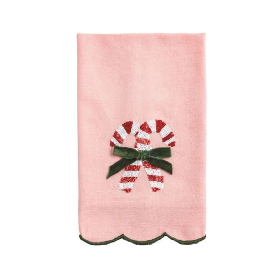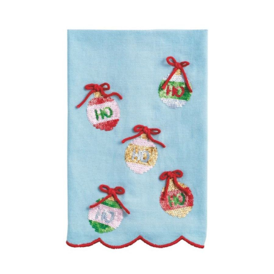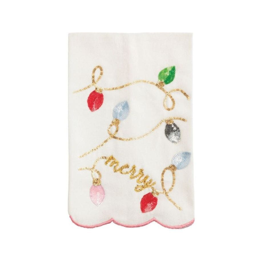 Cotton hand towel features sequin appliqués and satin stitched serged scallop edge.