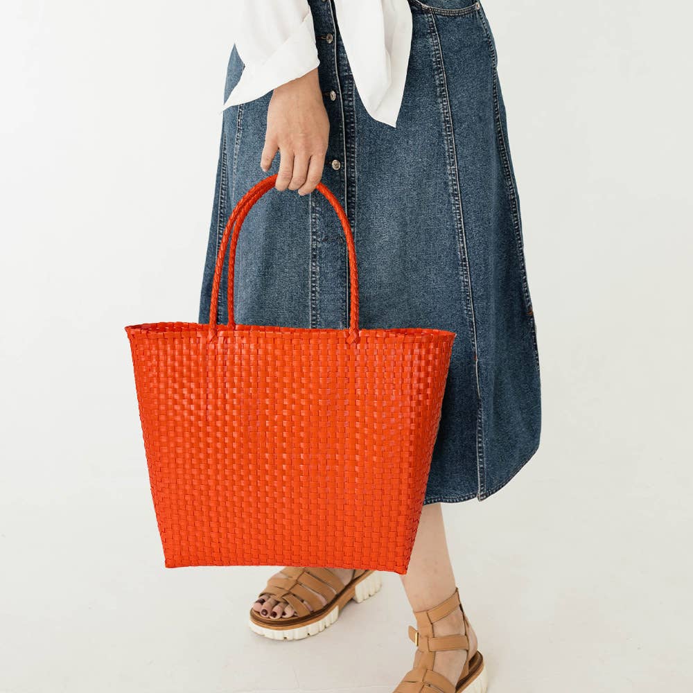 Basket Weave Tote Bag / Shoulder Bag • Size : 16" X 12" X 4.5" • Top Handle Size : 7" L • Material : 100% Eco-Plastic • Hand Made