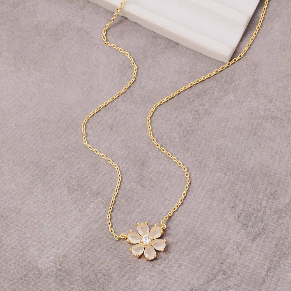 This necklace showcases a unique gold dipped cubic zirconia flower pendant style.