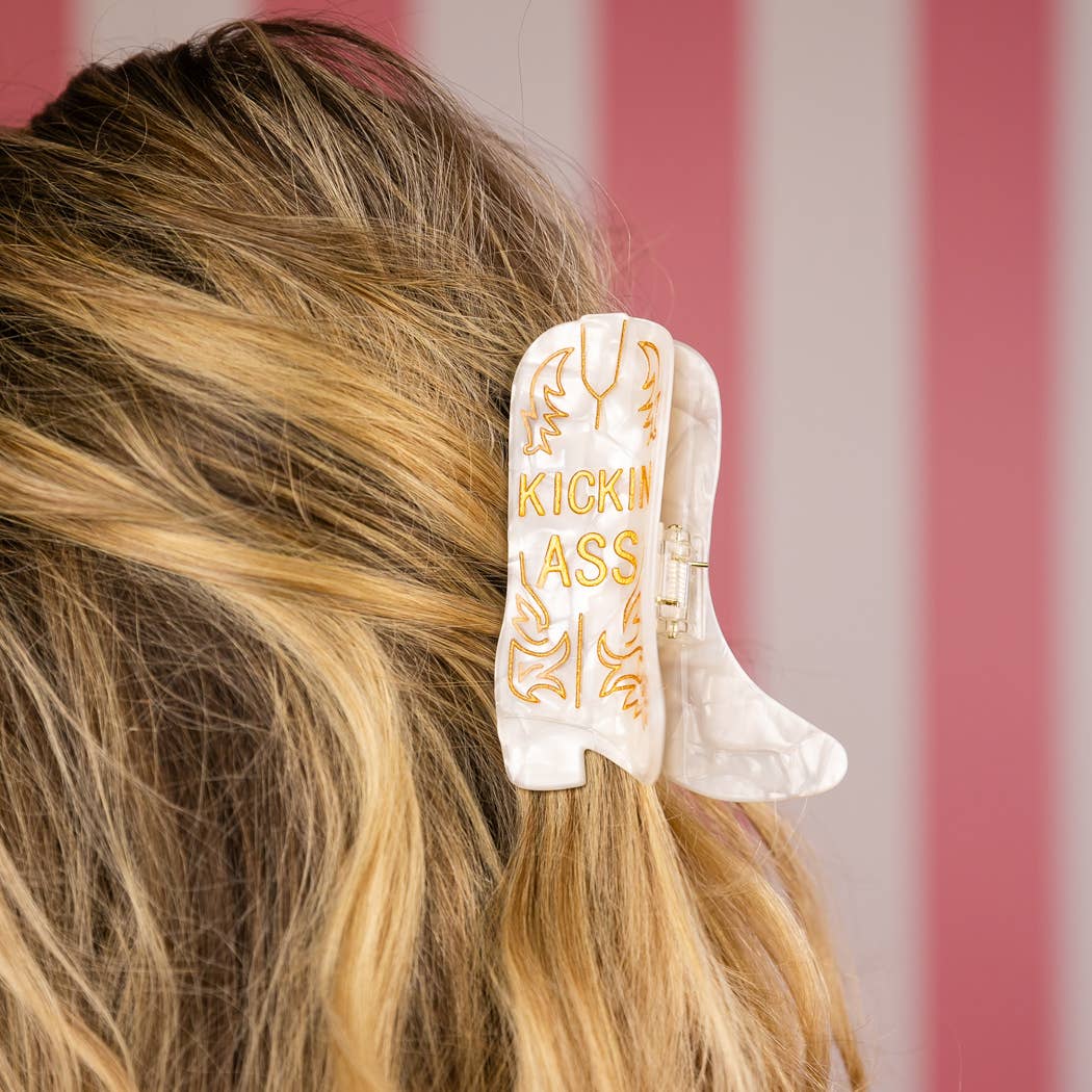 Saddle up, buttercup — this clip means business. Our Kickin’ Ass acetate hair claw clip brings all the yeehaw energy with a pearly western boot silhouette and bold gold lettering. It’s the perfect accessory for rodeo days, workdays, meltdown days, and every day you’re out here doing your damn best.