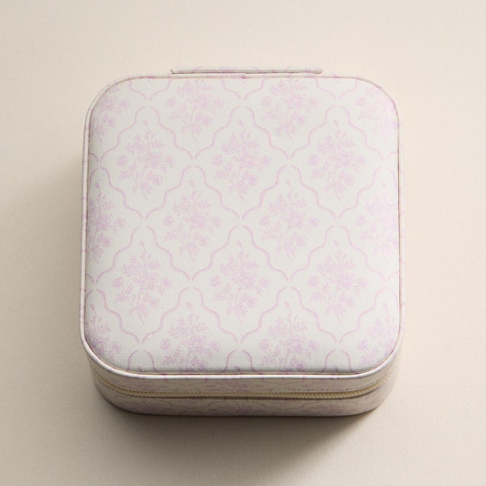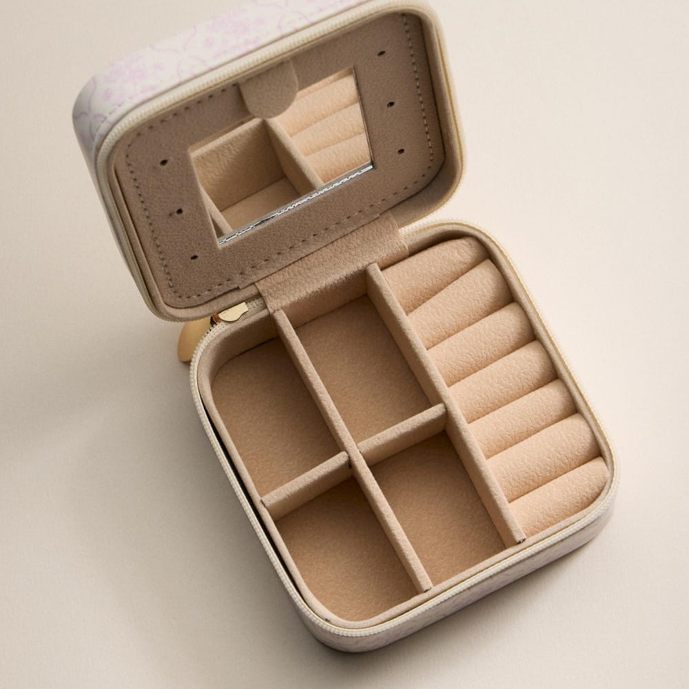 Details: * Gold-tone zipper pulls * Ring rolls + divided compartments * Earring holes + interior mirror * Soft velvet interior lining * Compact and travel-friendly design * 3.5" W x 3.5" D x 2" H