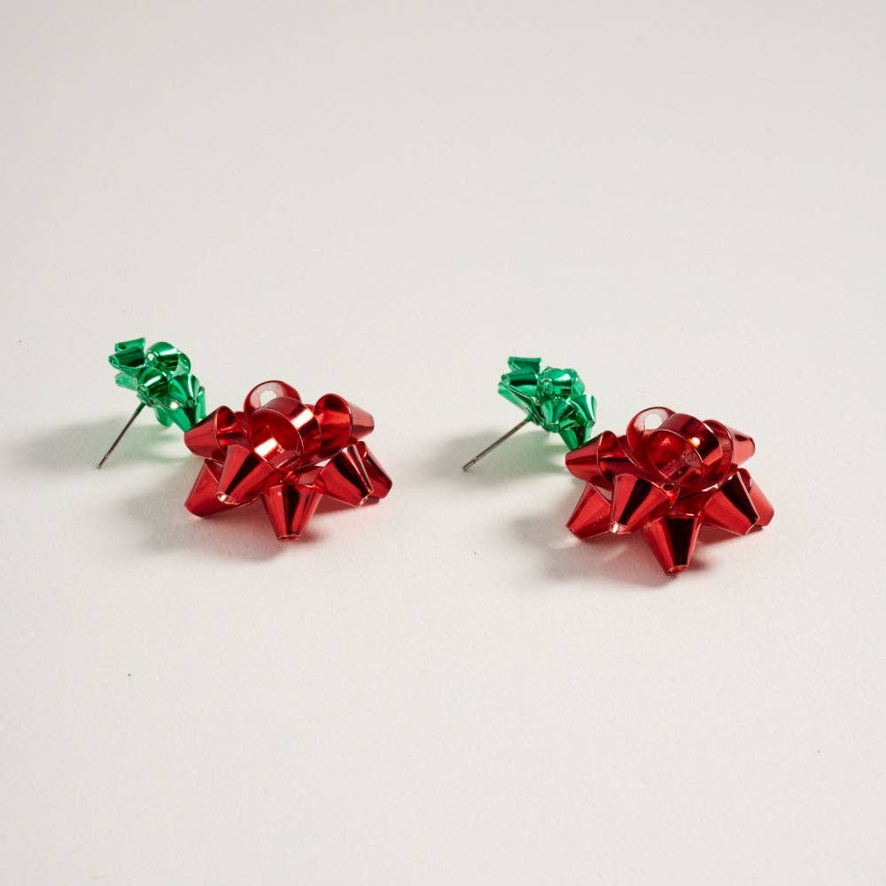 Add a festive pop to your outfit with these two-tone Christmas bow earrings. The solid 2-inch design makes a cheerful and eye-catching holiday statement.