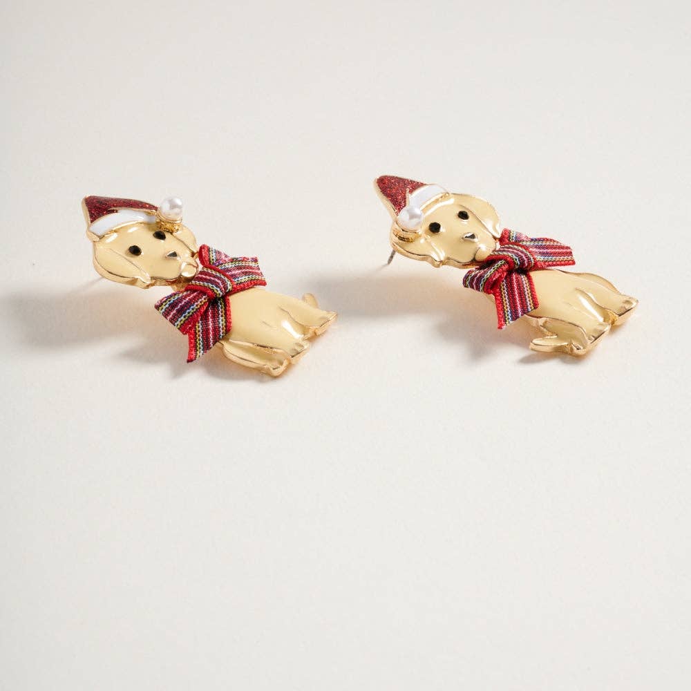 Perfect for dog lovers, these post earrings feature a lovable Golden Retriever ready for the holidays in a festive bow.