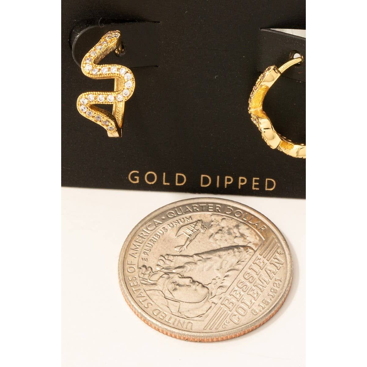 This pair of hoop earrings displays a vibrant gold dipped cubic zirconia zigzag pave hinge style.