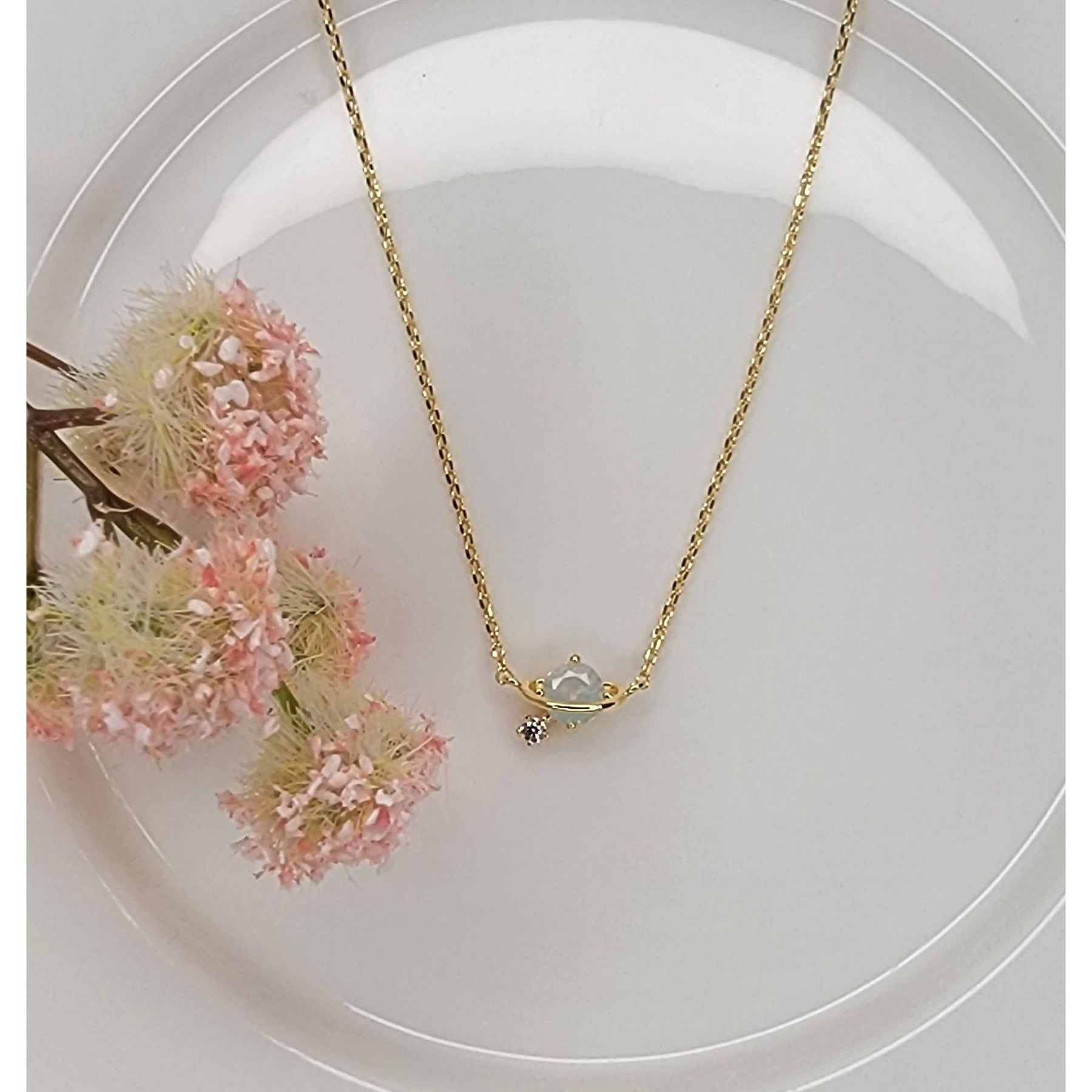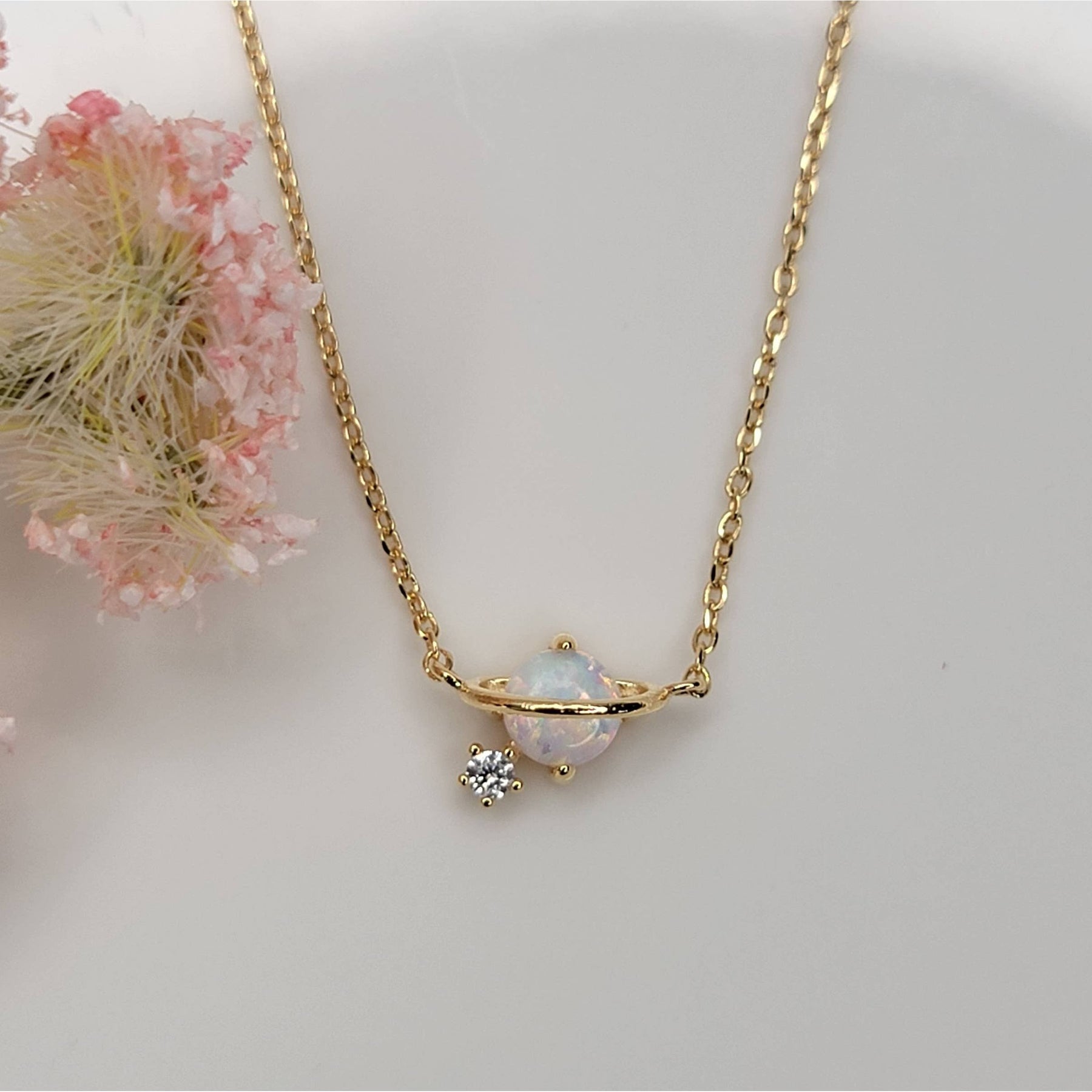 OPAL PLANET NECKLACE. MATERIAL: OPAL STONE/LAB GROWN OPAL, LEAD & NICKEL FREE. LENGTH: 9/32"" WIDTH: 5/16" CHAIN: 18"