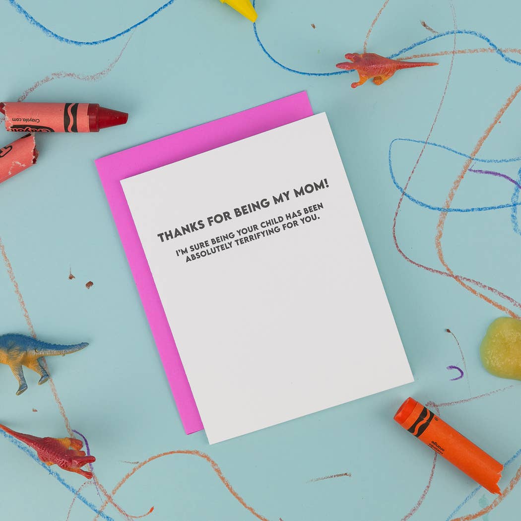 Our “Thanks For Being My Mom (I’m Sure Being Your Child Has Been Absolutely Terrifying For You)” card is the perfect mix of heartfelt and unhinged - just like motherhood. Letterpress printed on luxe tree-free paper and paired with a bold neon pink envelope, this fan-favorite delivers the kind of honesty moms actually appreciate.
