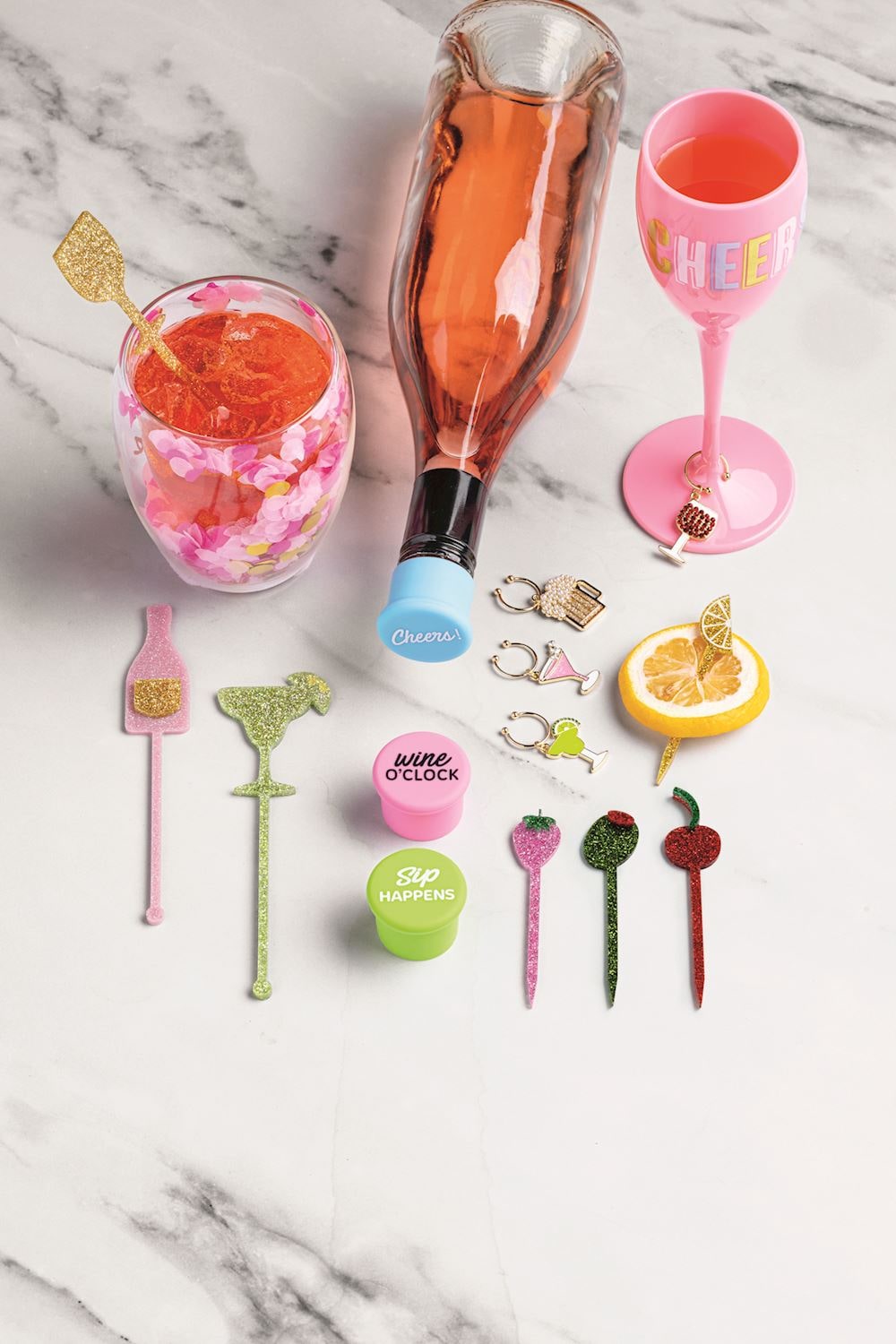 Set of acrylic drink stirrers, cocktail picks, silicone bottle stoppers or enamel wine charms.