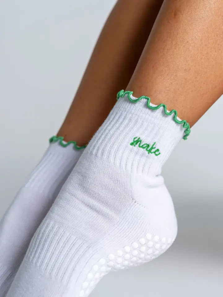 The softest, grippiest socks you'll ever own. Our Ruffle grip socks are crafted from premium combed cotton with long-lasting silicone grips that, providing exceptional stability and support for any form of movement. The durable silicone base ensures you stay steady, while built-in arch compression offers extra support. Breathable, moisture-wicking, and ultra-soft, these socks keep you comfortable all day long. Our Ruffle range features graphics of your favourite Pilates moves.