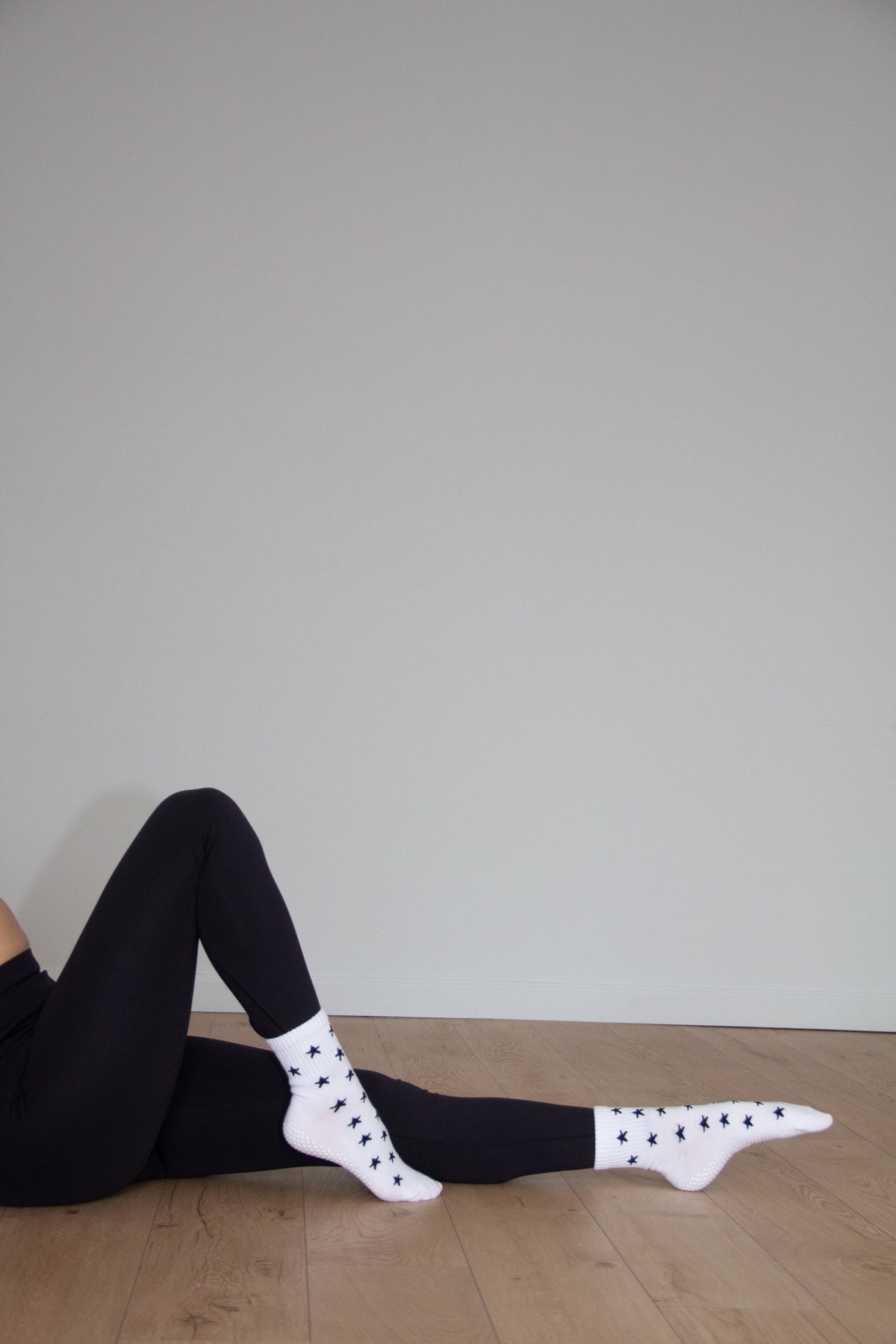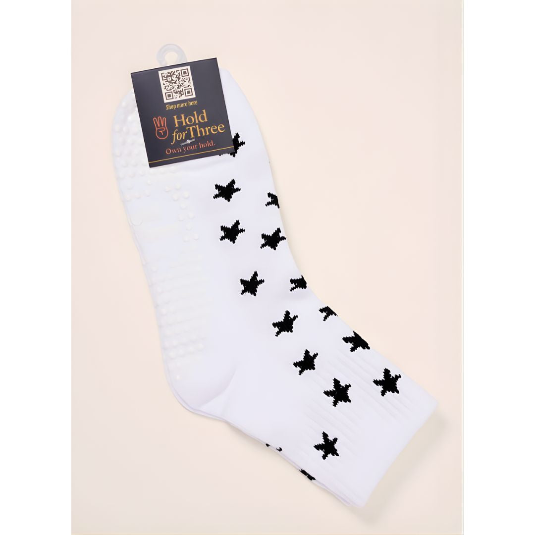 White above the ankle tube socks with black star design. White grips on bottom. Fits Women's Sizes 4-12.