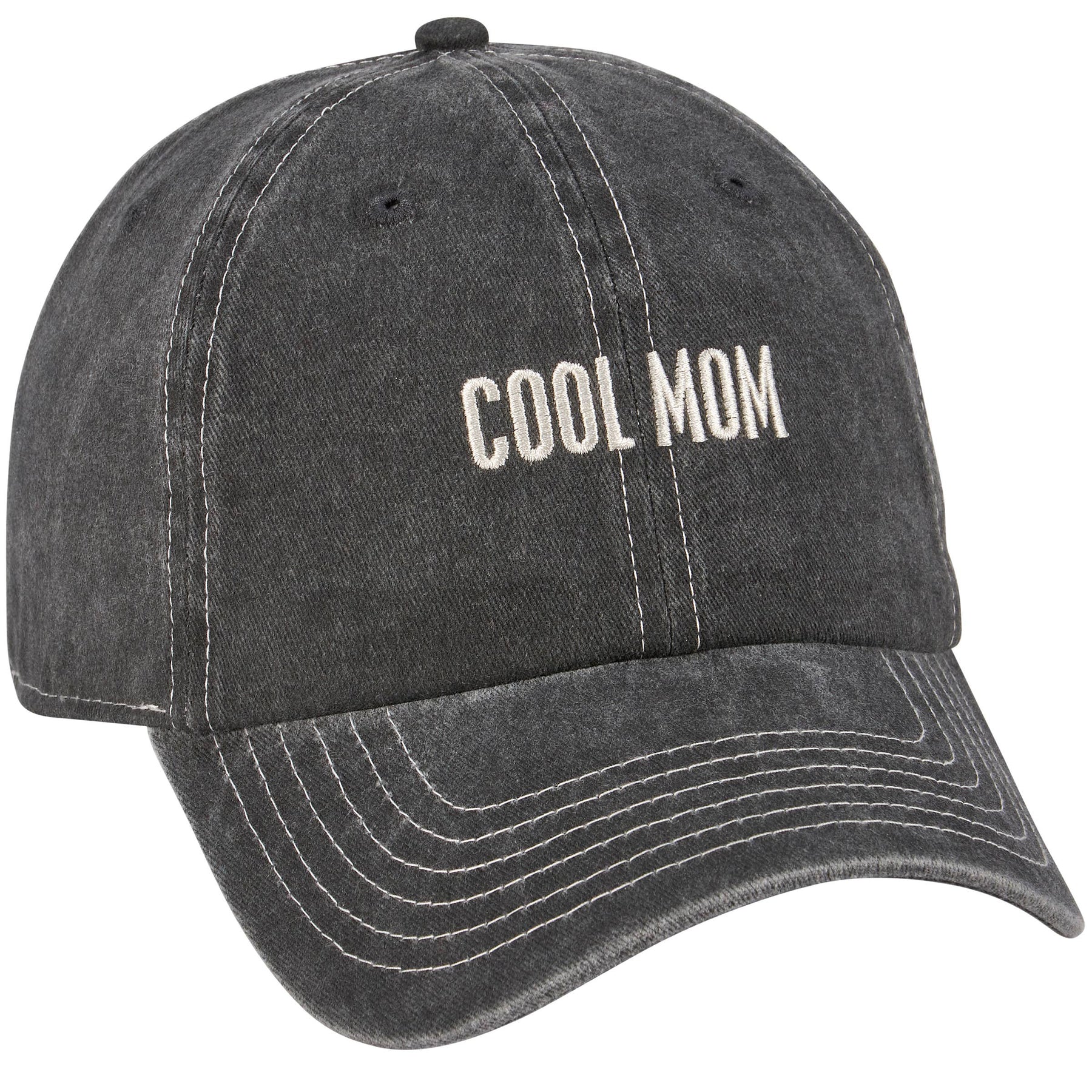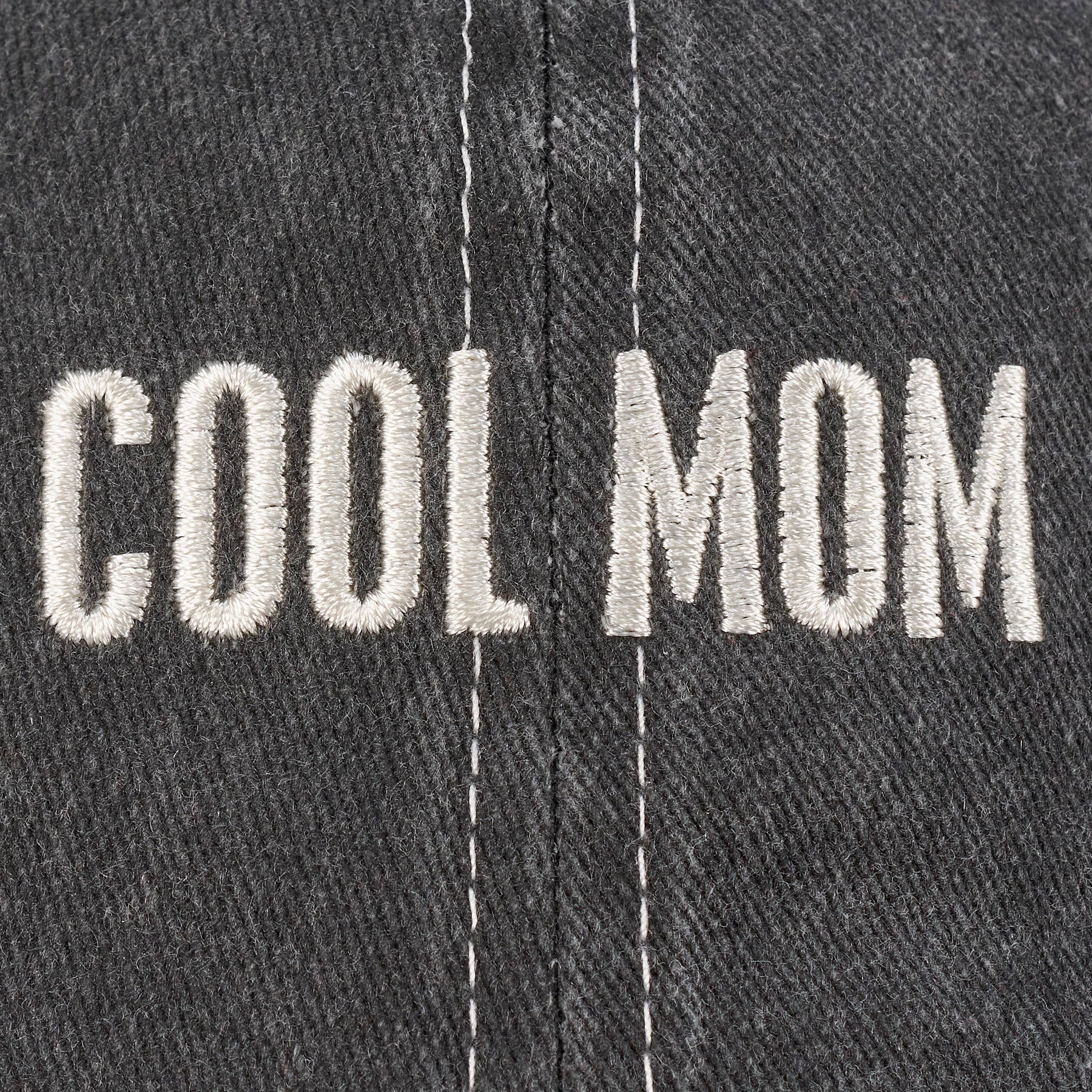 A stonewashed black baseball cap from our Mother's Day Collection displaying a fun mom inspired sentiment in a box sign style that reads "Cool Mom" with cream thread accents. Mom hat features fully embroidered sentiment for added detail. Our Cool Mom baseball cap is one size fits most with an adjustable metal buckle to create the perfect fit. Hand wash only.