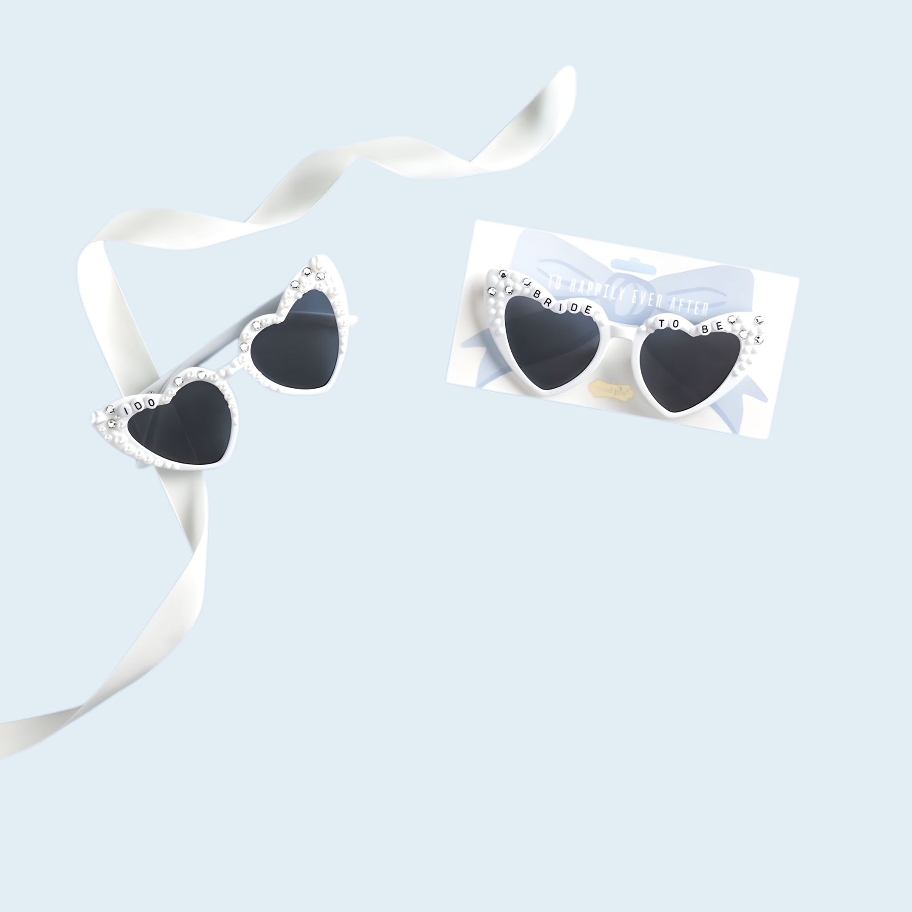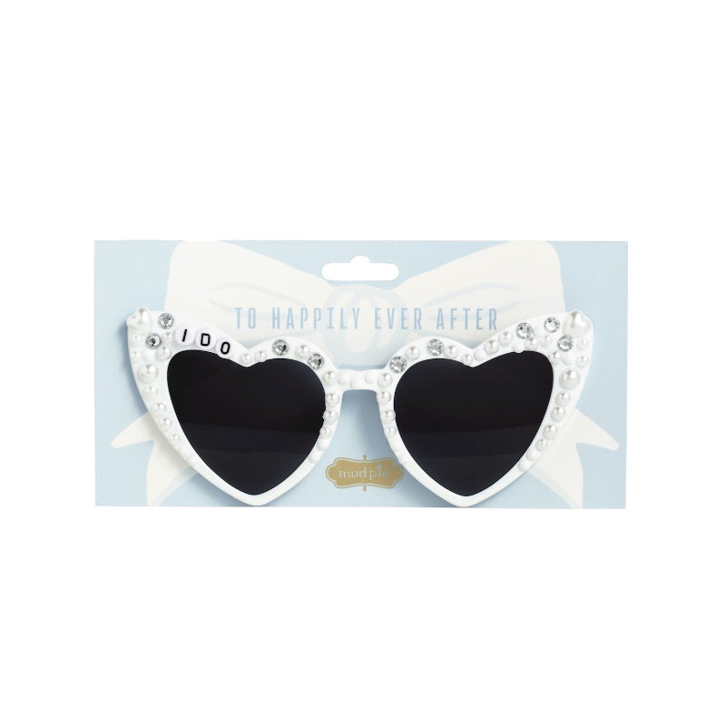 Heart shaped sunglasses feature rhinestone and letter bead rims.