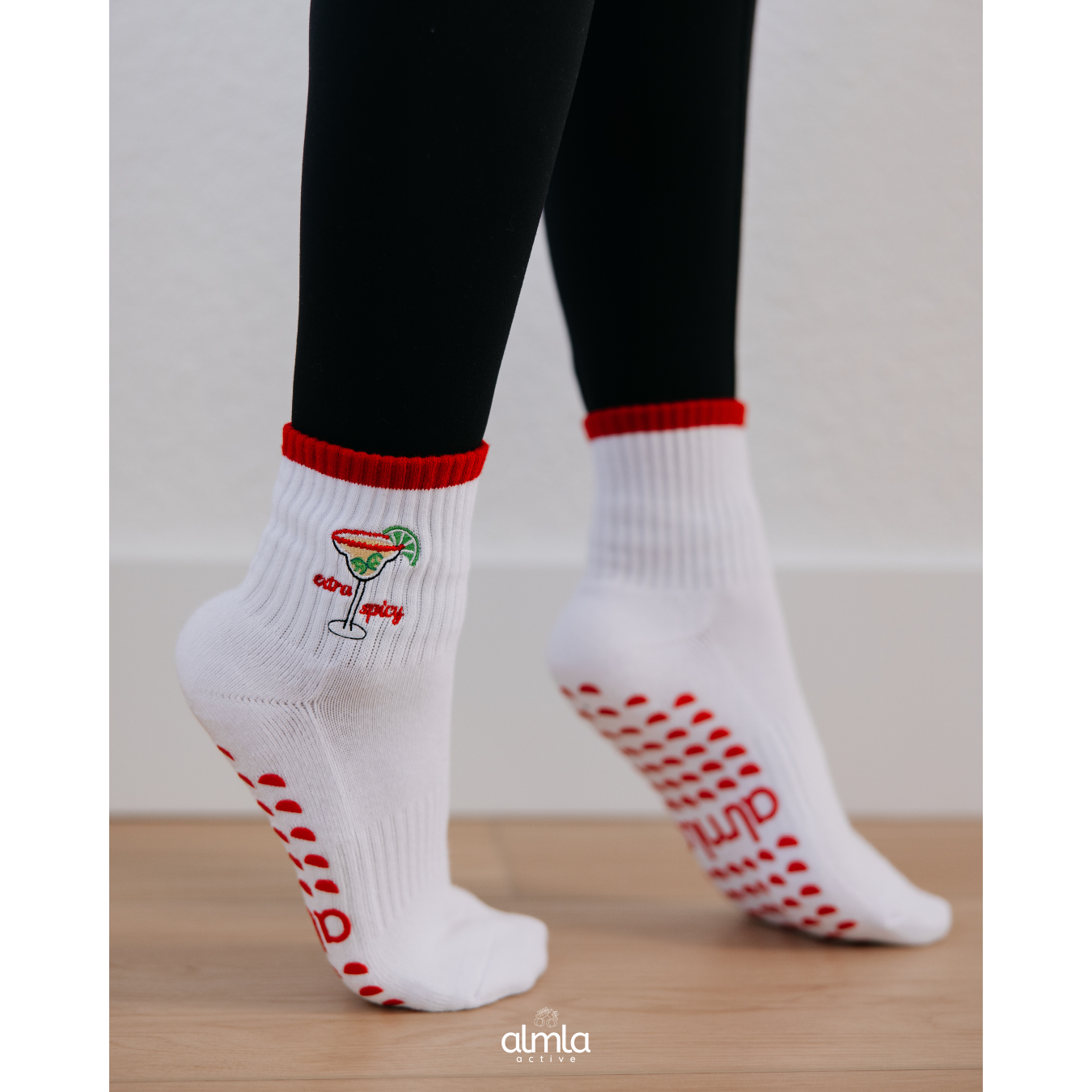 Introducing Extra Spicy Pilates Grip Socks Featuring an embroidered spicy margarita on a white sock with vibrant red accents and lime-shaped grips for the perfect blend of bold style and stability in the studio or on the go.