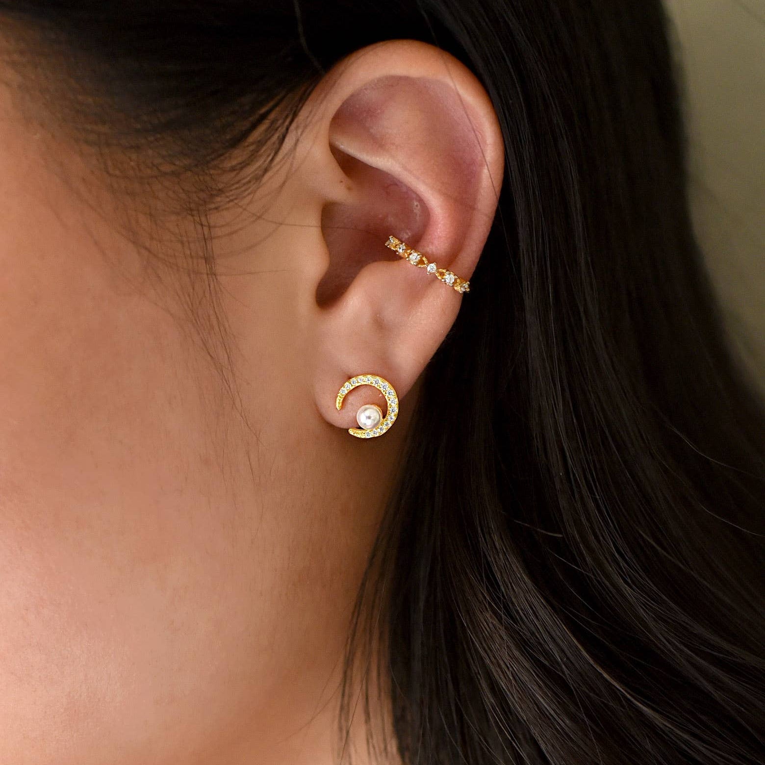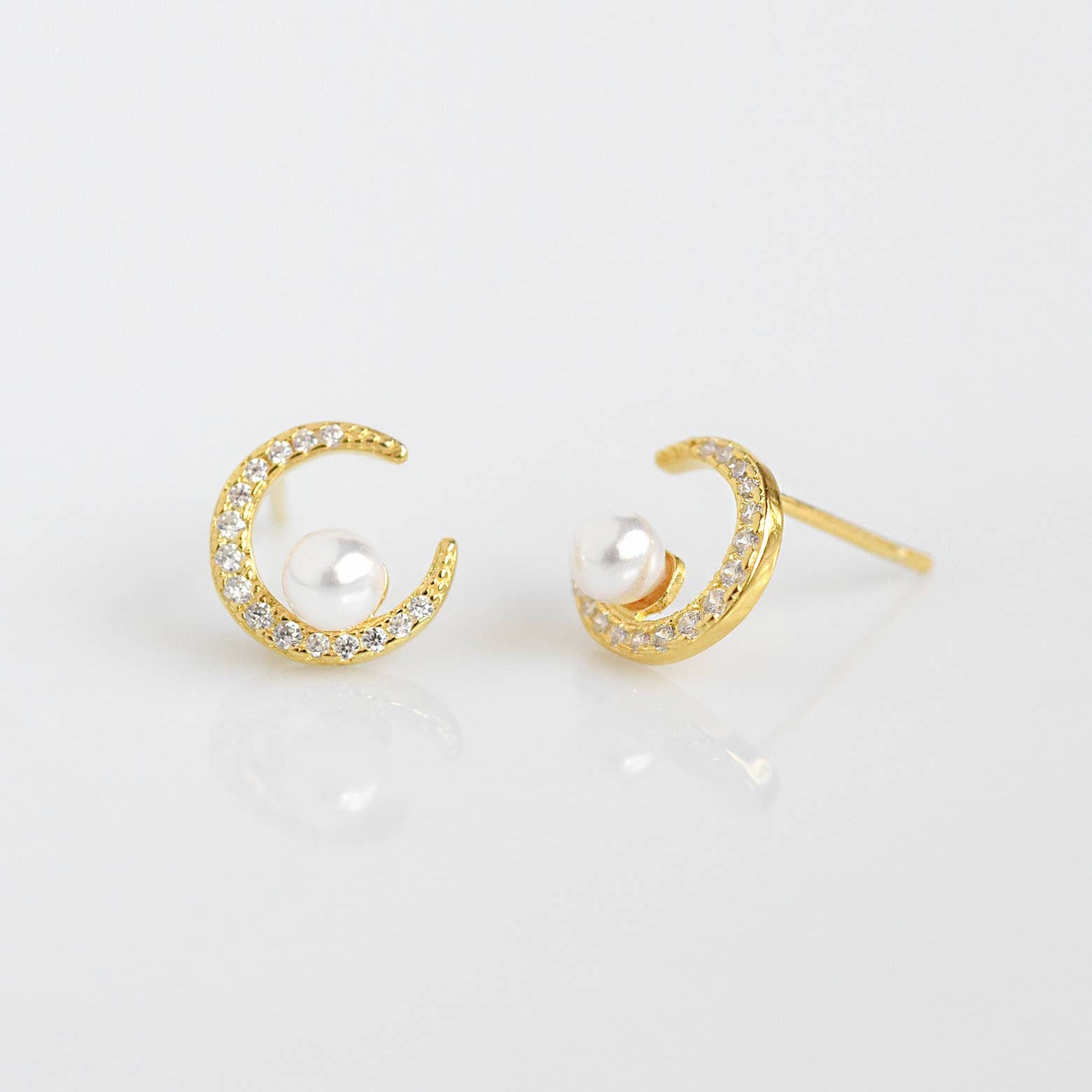 925 Silver CZ Crescent Moon and Pearl Stud Earrings