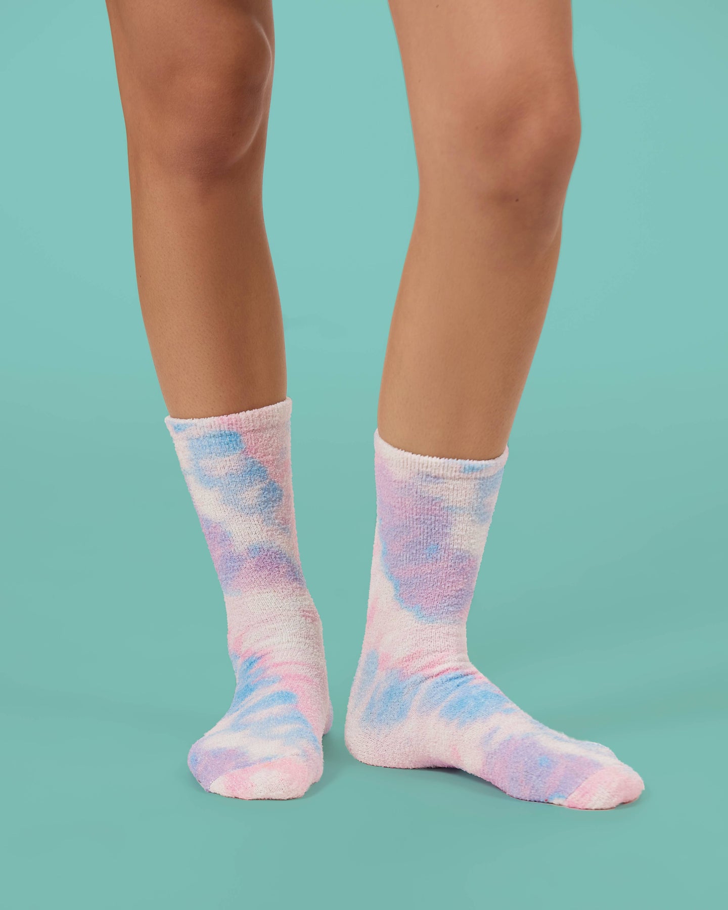 With our Tie Dye Infused Cozy Crew Sock, you'll be feeling absolutely groovy! This cozy sock, made of fuzzy material, is woven with an allover pastel tie dye print for a dreamy night time visual to go with that soothing scent infusion. A non skid bottom makes these perfect for a dozy day at home. Each sock is infused with soothing botanicals for a therapeutic experience.